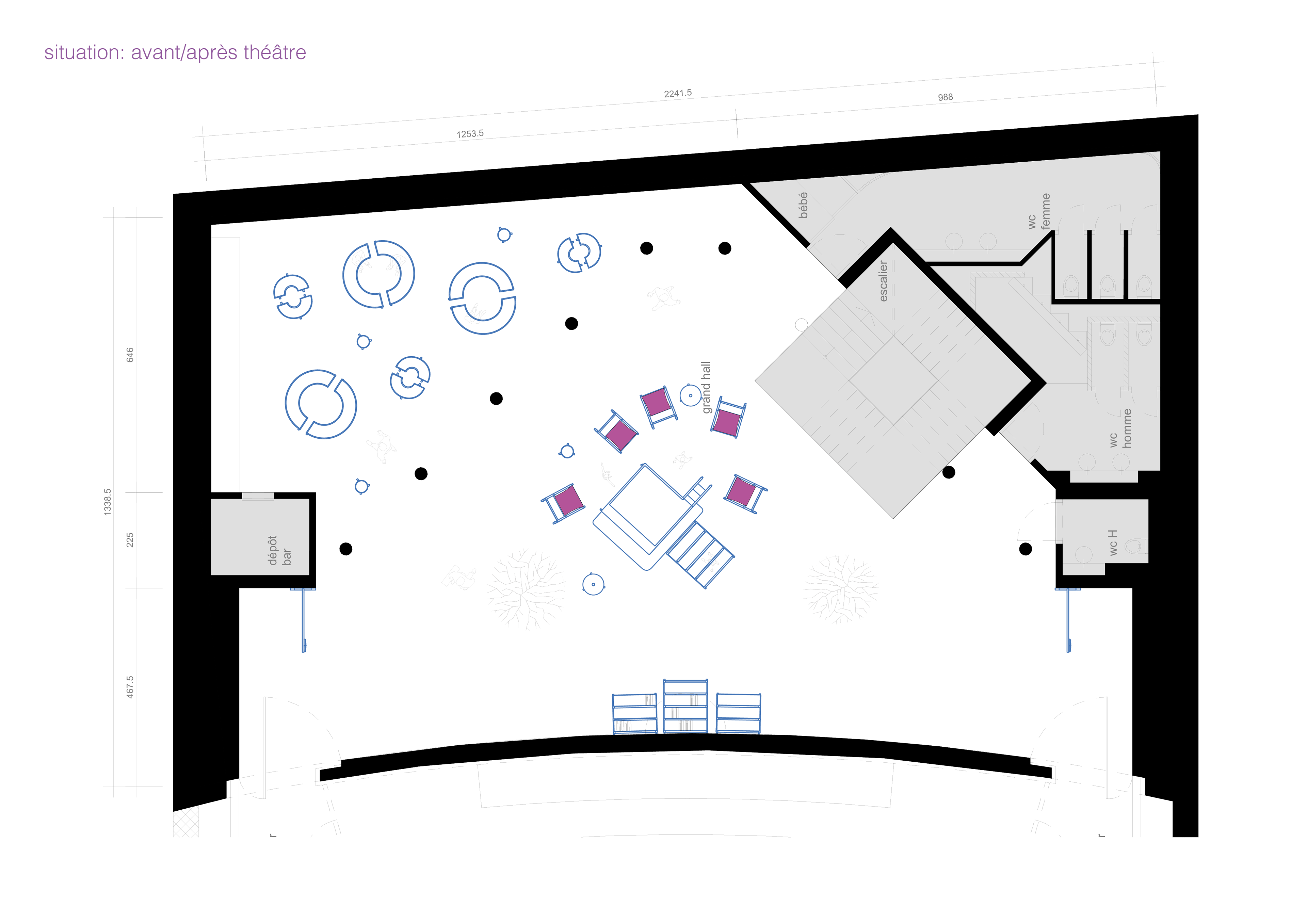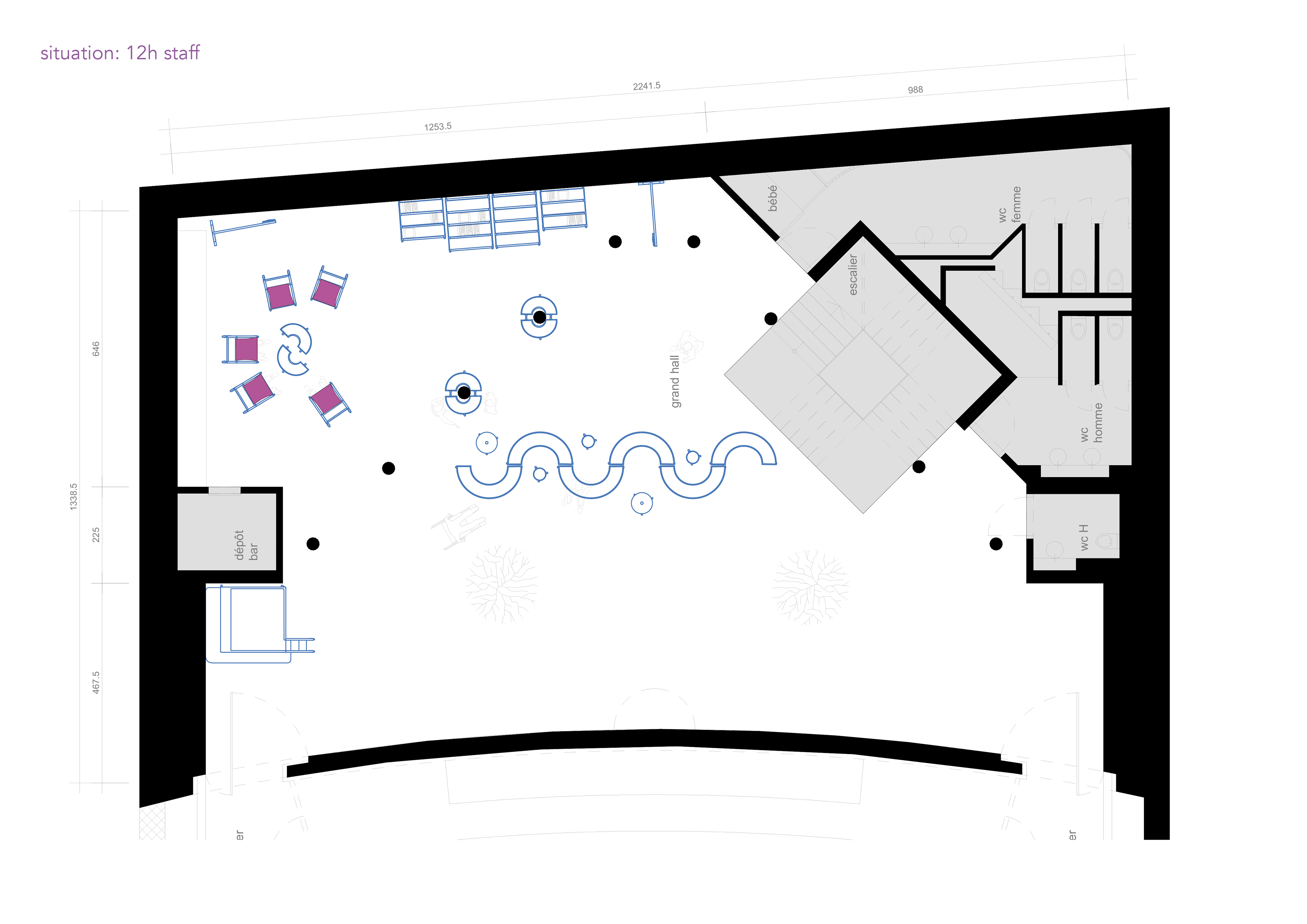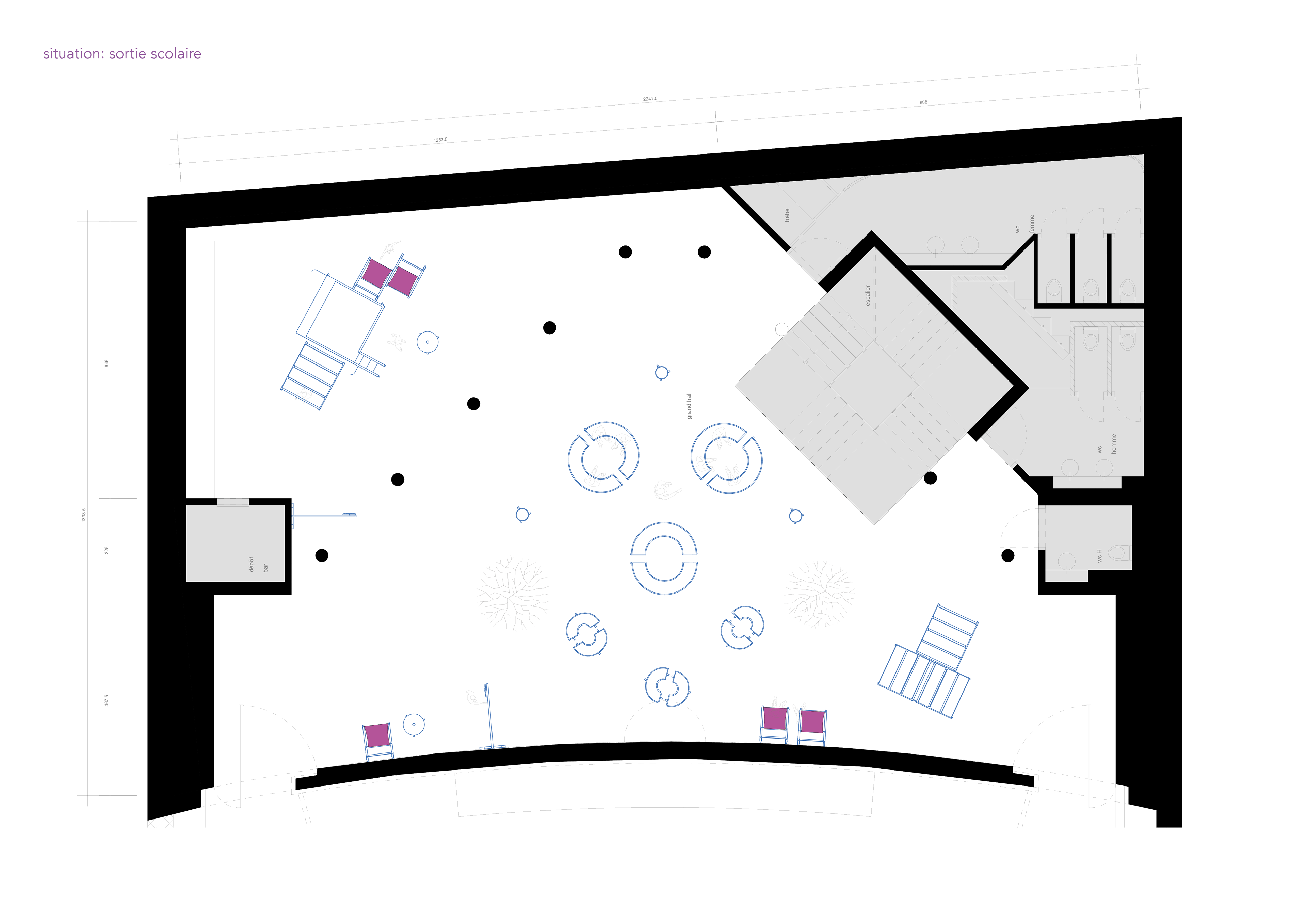 Am Stram Gram est un théâtre pour enfants situé aux Eaux-Vives à Genève. Derrière sa façade discrète, le bâtiment s’étend sur quatre niveaux et accueille plusieurs espaces scéniques ainsi que des lieux ouverts au public. Durant une semaine, nous avons été invités à analyser et à ré-imaginer la grande salle du théâtre, un espace polyvalent qui fait office de bar, de zone d’attente, de vestiaire et parfois même de salle d’atelier.