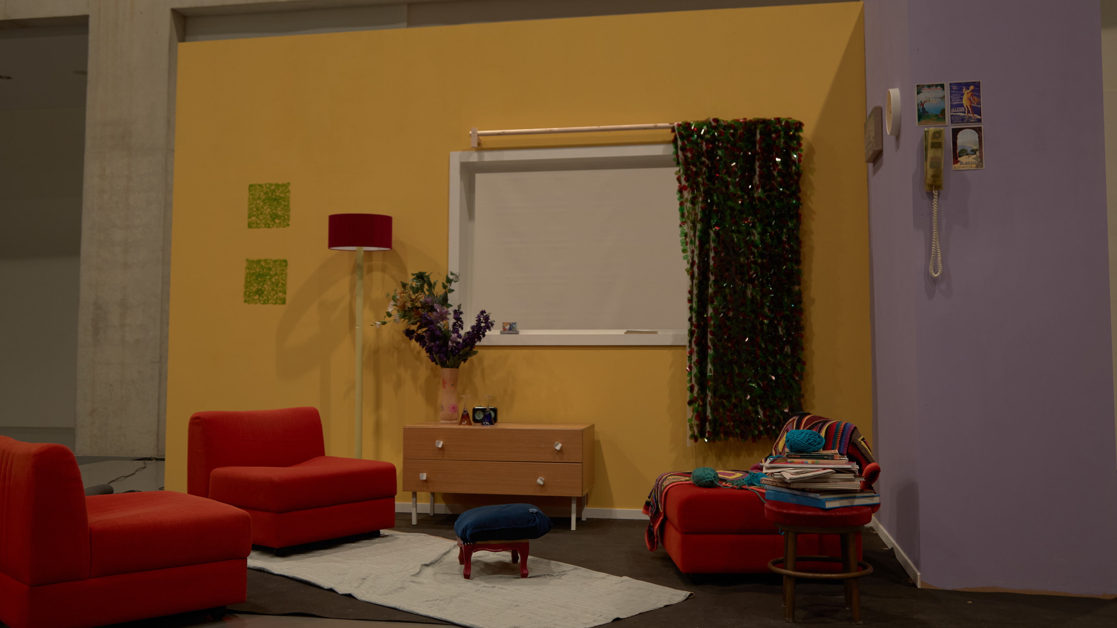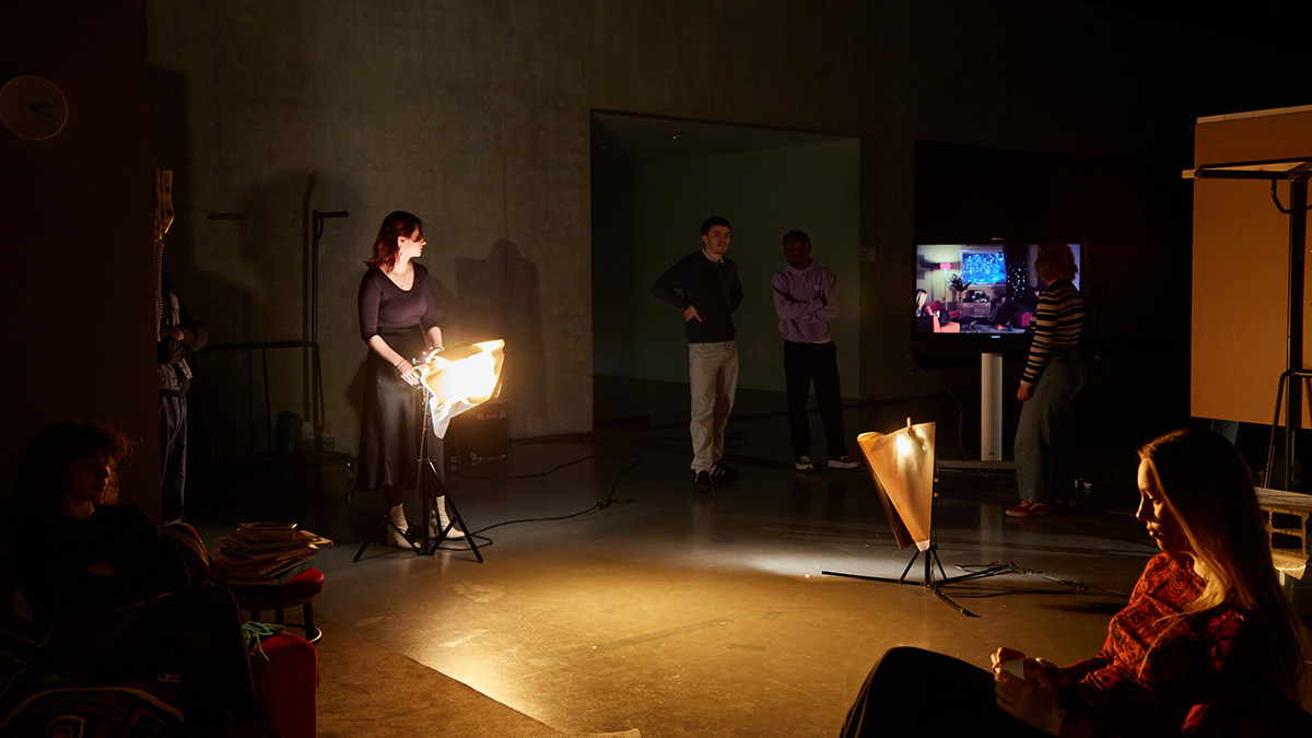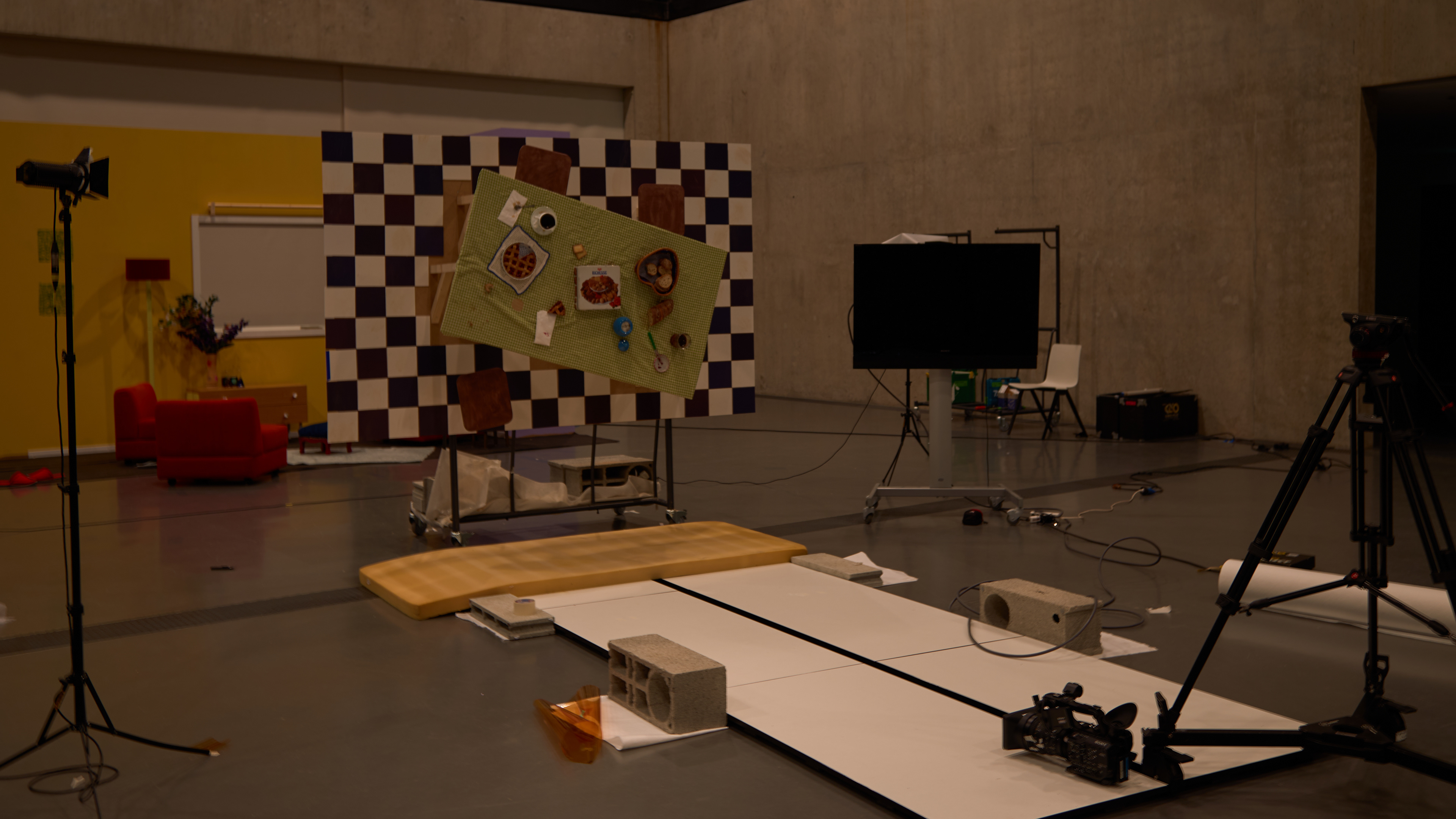 Ce projet a été développé lors d’un workshop d’une semaine réunissant les étudiant·e·x·s du Département Cinéma et du Département Design d’Intérieur de la HEAD, Genève. Notre objectif était de concevoir un véritable décor de tournage permettant de filmer cinq moments distincts de la nuit, du crépuscule à l’aube, recréés artificiellement dans un même espace.