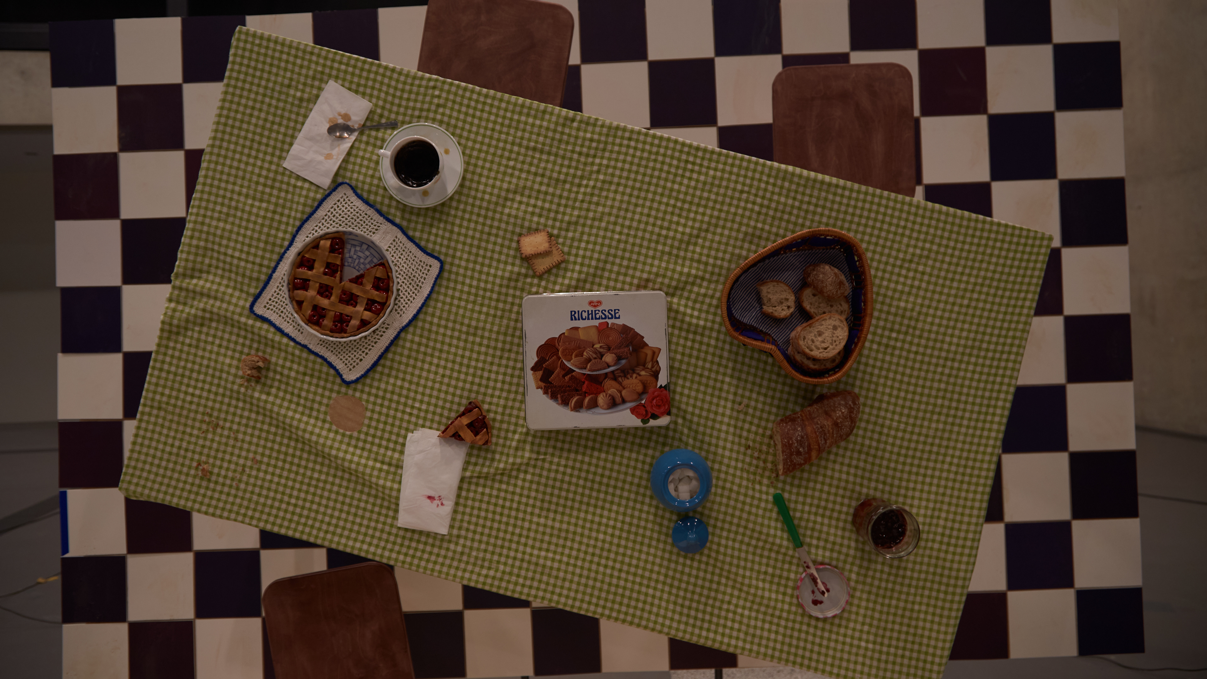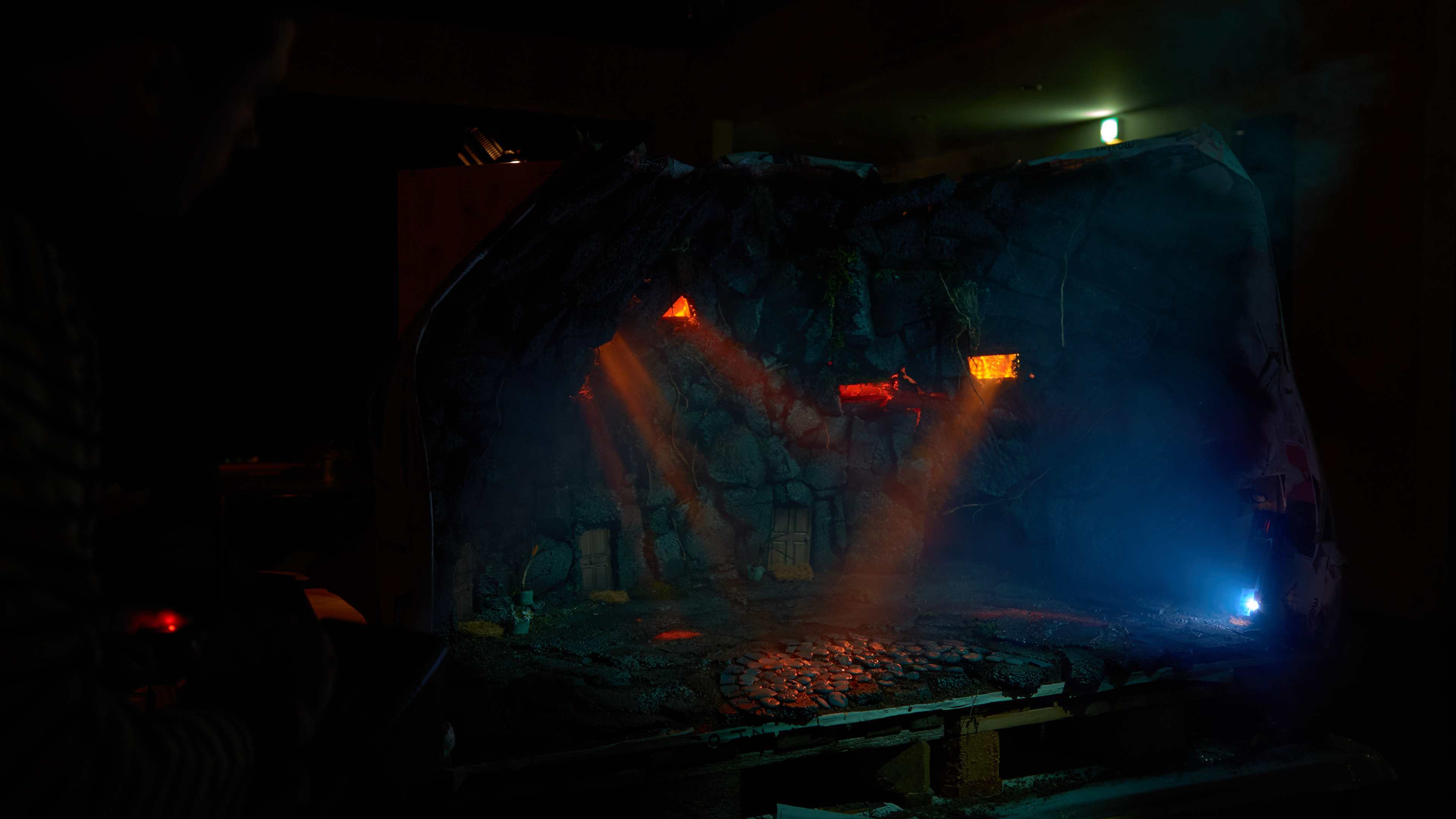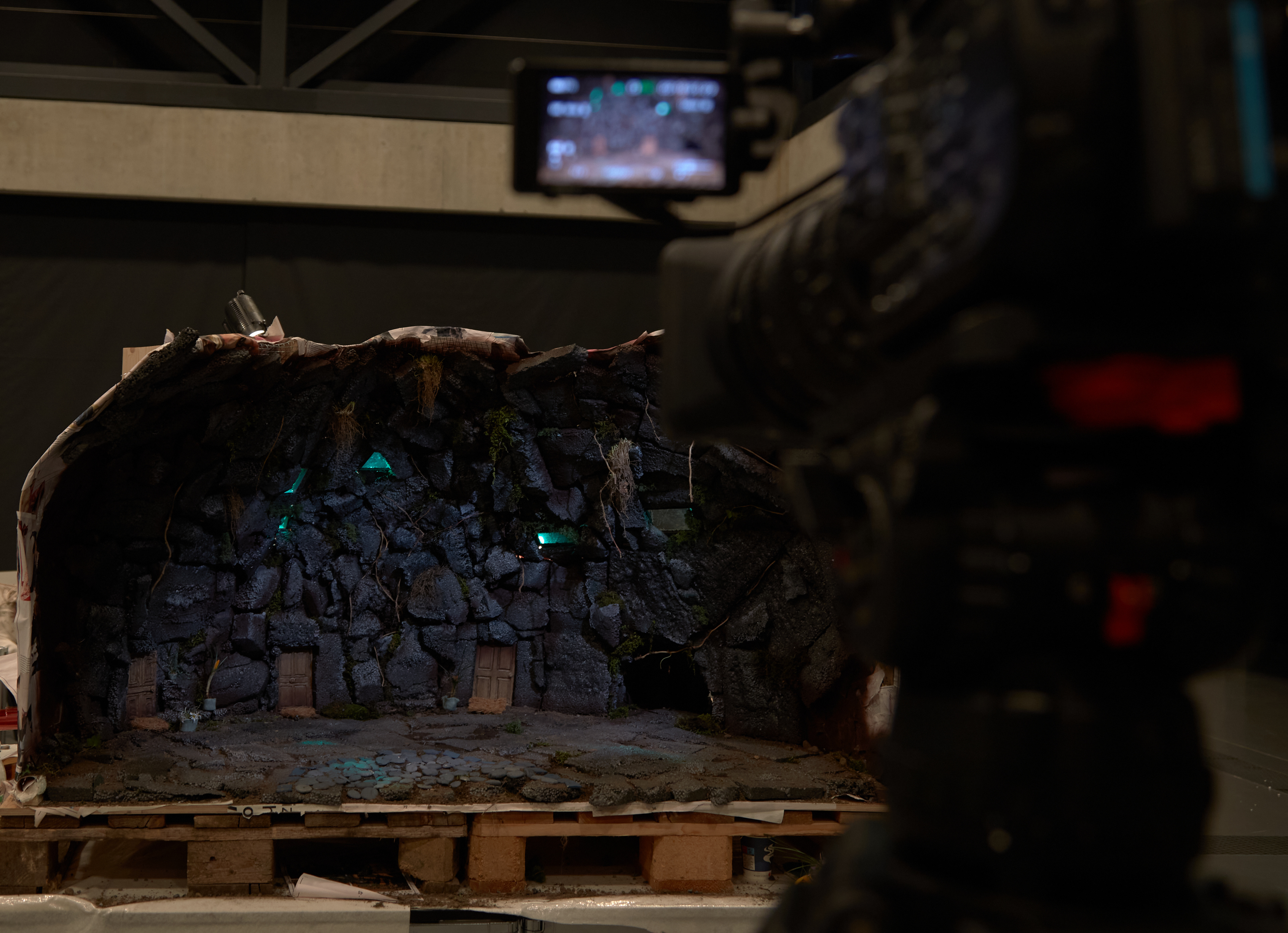 Le dispositif devait répondre à plusieurs contraintes, notamment imaginer des accessoires adaptés à l’échelle du tournage, assurer une cohérence spatiale entièrement construite pour la caméra et mettre en place un système d’éclairage capable de générer différentes ambiances nocturnes. L’ensemble devait former un environnement immersif, modulable et expressif.