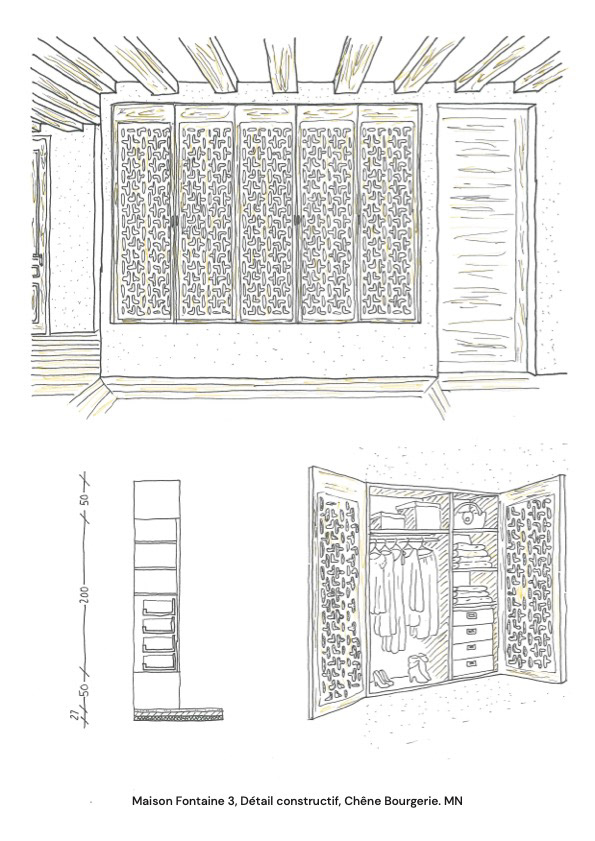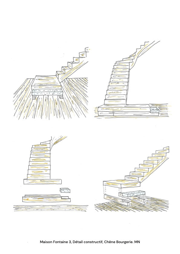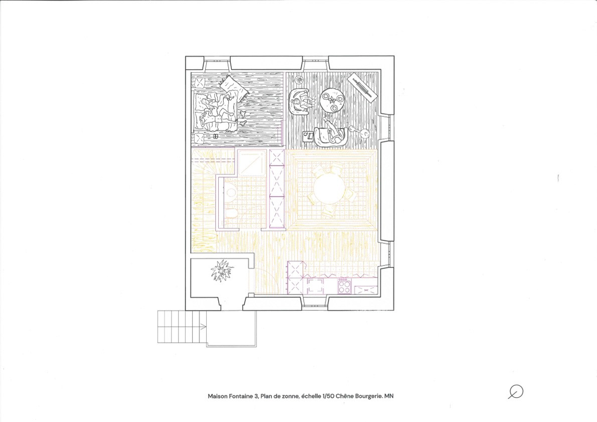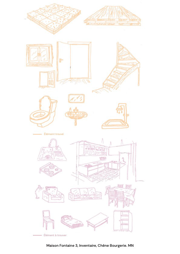Mon intervention s’inscrit dans cette approche, en cherchant à préserver et sublimer les matériaux déjà présents dans le bâtiment. Après un relevé sur site et un inventaire détaillé des éléments constructifs, j’ai choisi de réutiliser le parquet existant et d’y intégrer des matériaux récupérés chez SA Démolition, afin de composer de nouvelles trames au sol.