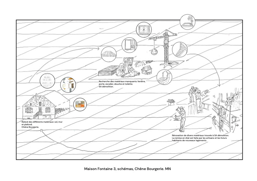 Ce projet met en avant une démarche de réemploi et de participation des habitant·e·x·s, les invitant à s’impliquer dans la transformation de leur lieu de vie et dans la redéfinition de ses matières, de son histoire et de son usage.