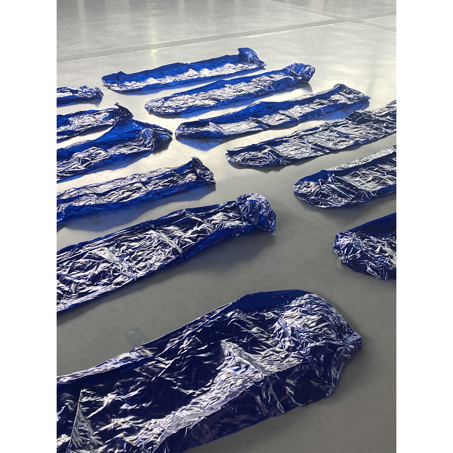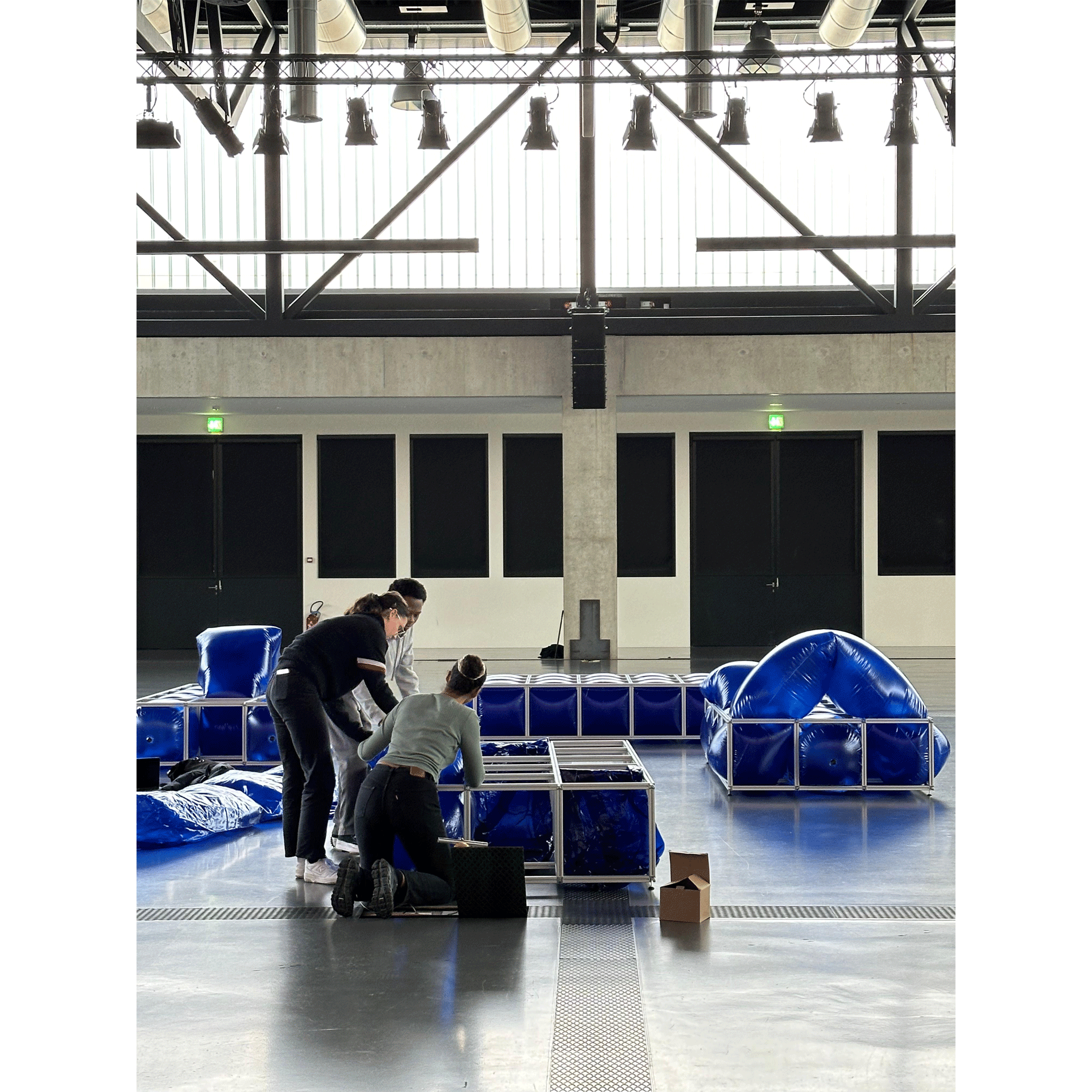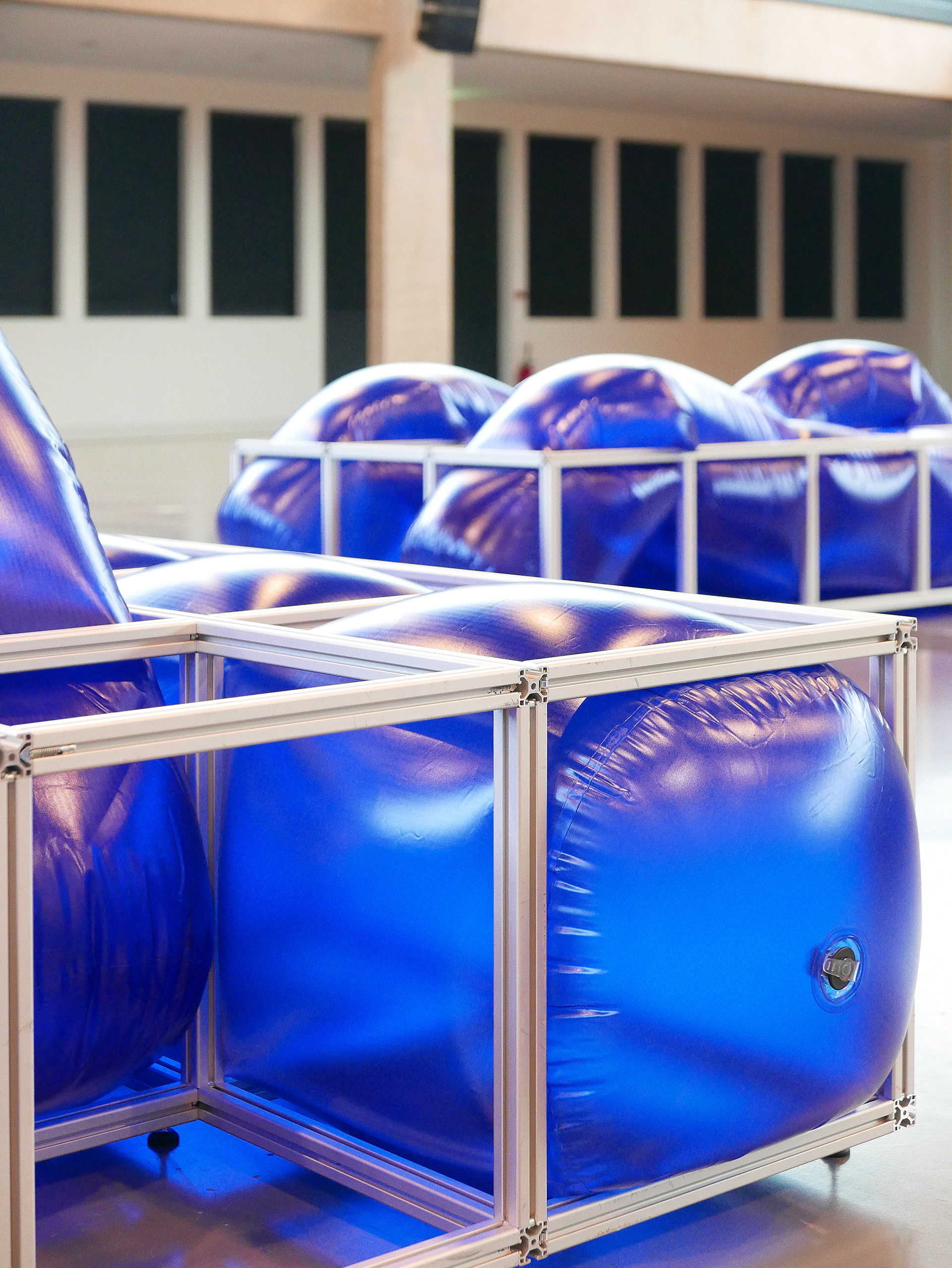 Les structures gonflables se sont imposées comme une solution évidente, combinant légèreté, modularité et impact spatial. Leur forme évoque à la fois l’enfance et le jeu, tout en dialoguant avec une grille métallique en aluminium qui structure l’ensemble.